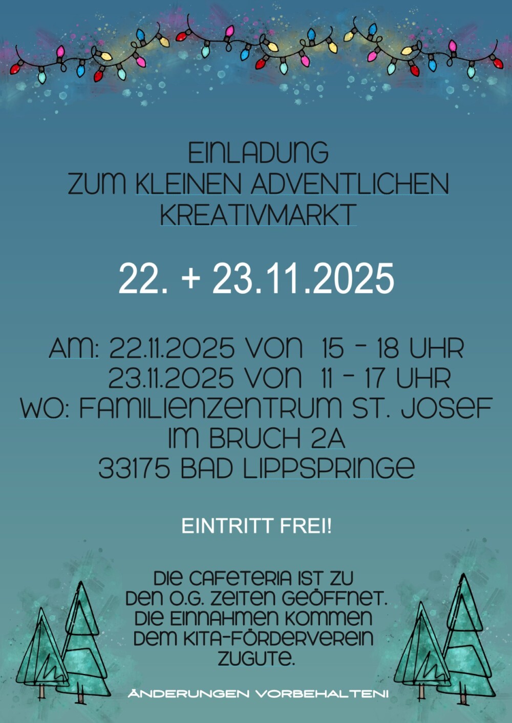 Auch in diesem Jahr findet der adventliche Kreativmarkt wieder in den Räumen des Familienzentrum St. Josef statt.Wir bieten für die Advents-/Weihnachtszeit und andere Gelegenheiten wieder kleine Geschenkideen, Schönes aus Stoff, Wolle, Holz, Papier; Dekoartikel; Dekoleuchten u.v.m. an.Der Kreativmarkt hat zu folgenden Zeiten geöffnet: Samstag: 14 – 18 UhrSonntag: 11 – 17 Uhr Unterstützt werden wir auch in diesem Jahr wieder vom Förderverein der KiTa. Dieser bietet zu den oben genannten Öffnungszeiten eine Cafeteria an. Die Einnahmen kommen den KiTakindern zu…