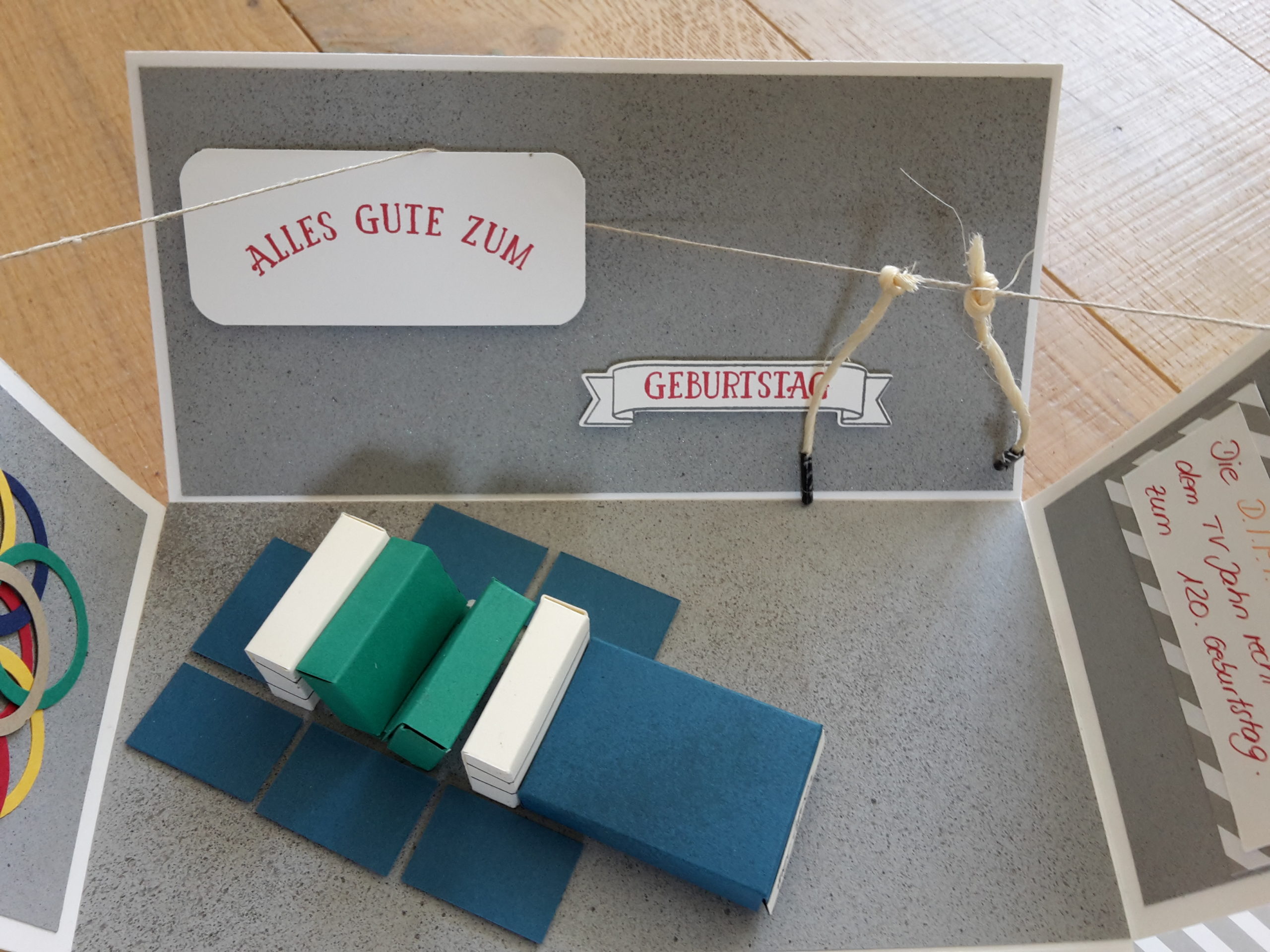 Unser hiesiger Turnverein feiert in diesem Jahr das 120 jährige Bestehen. Gestern wurden wir als Vereinsvorsitzenden zu einer Feierstunde eingeladen. Tja und dann steht man da und weiß nicht genau, was schenkt man. Unter Druck geht es ja gewöhnlich am Besten, aber mir wollte am Samstag einfach nichts einfallen. Der Tag war anstrengend und so konnte ich mich nicht mehr aufraffen, an den Schreibtisch zu gehen. Also musste am Morgen noch was passieren. Früh wach, Überlegungen …… dann endlich eine Idee und dann ging es los. Was kann man anderes machen, als eine Art von Turnhalle basteln, kleben und stempeln. Ein paar Reifen an der einen Seite, zwei Tau´s, und eine kleine Bewegungslandschaft.Und das ist dann dabei raus gekommen.
