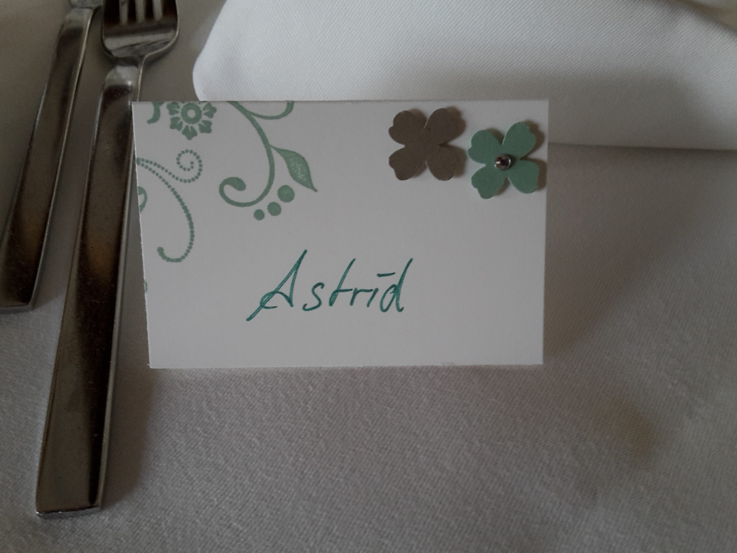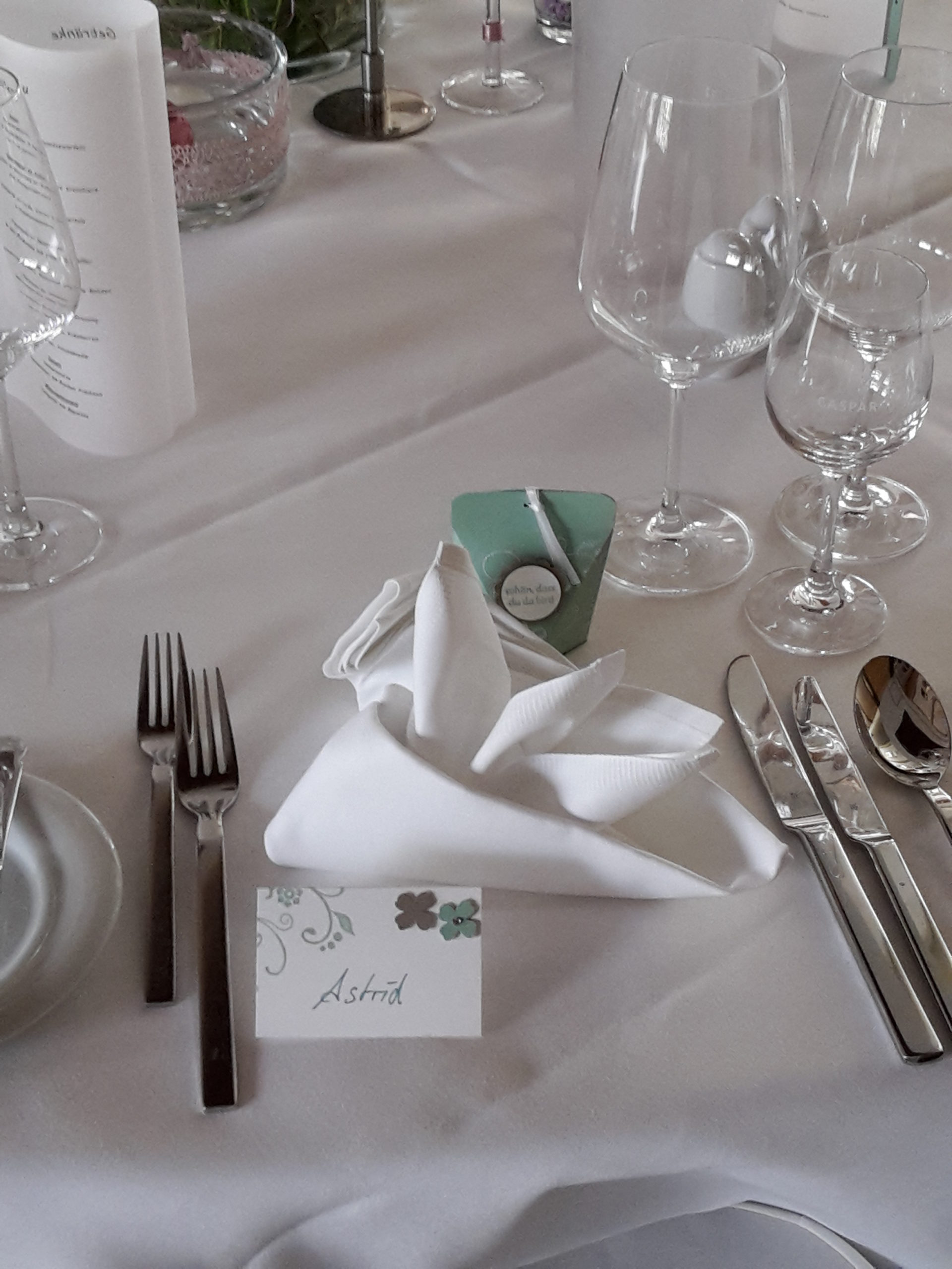 Viele GesprĂ€che hatten wir bzgl. der Namensschilder und Gastgeschenke. Die Farbkombination stand  relativ frĂŒh fest, minzmakrone, taupe und flĂŒsterweiĂ.  Doch bei den Gastgeschenke nahmen wir kurz vorher noch einen Wechsel vor. Es war eine gute Entscheidung, denn die selbstschliessende Box war, meiner Meinung nach, schöner, als die Pommes Box.